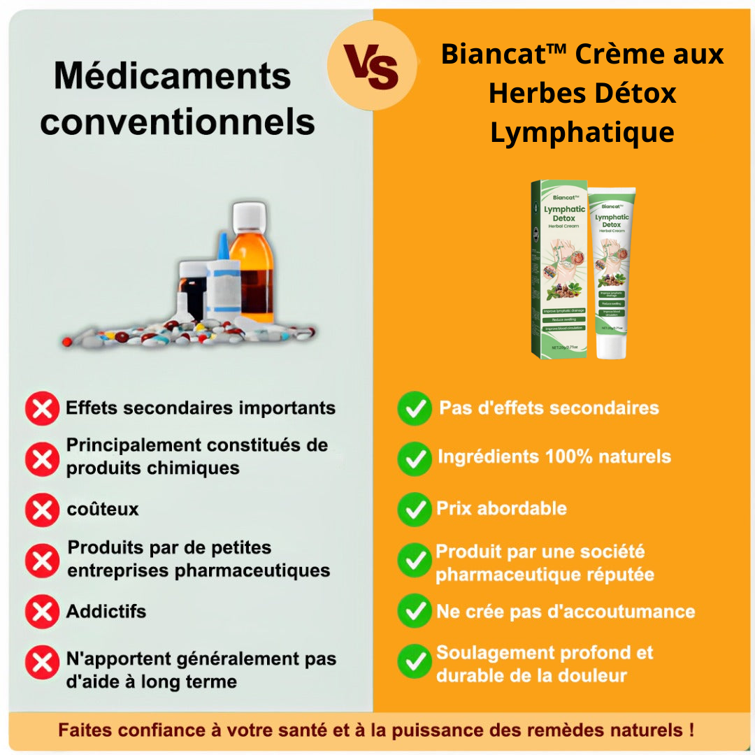 Biancat™ Crème aux Herbes Détox Lymphatique agit à la source pour traiter directement les causes de l'inconfort circulatoire. Formulée avec des extraits naturels puissants, elle stimule instantanément la circulation sanguine, réduisant les gonflements, les jambes lourdes et l'inflammation.