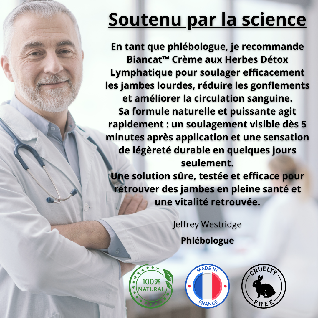 En tant que phlébologue, je recommande vivement Biancat™ Crème aux Herbes Détox Lymphatique pour soulager efficacement les problèmes circulatoires tels que les jambes lourdes, les gonflements et les varices.