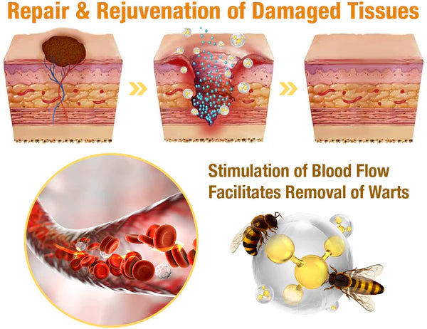 Un autre avantage important du venin d'abeille est sa capacité à améliorer la circulation sanguine. Il peut stimuler le flux sanguin dans la zone traitée, facilitant l'élimination des acrochordons ou des verrues en favorisant la régénération des tissus et en accélérant le processus de guérison, contribuant ainsi à la réparation et au rajeunissement des tissus endommagés.
