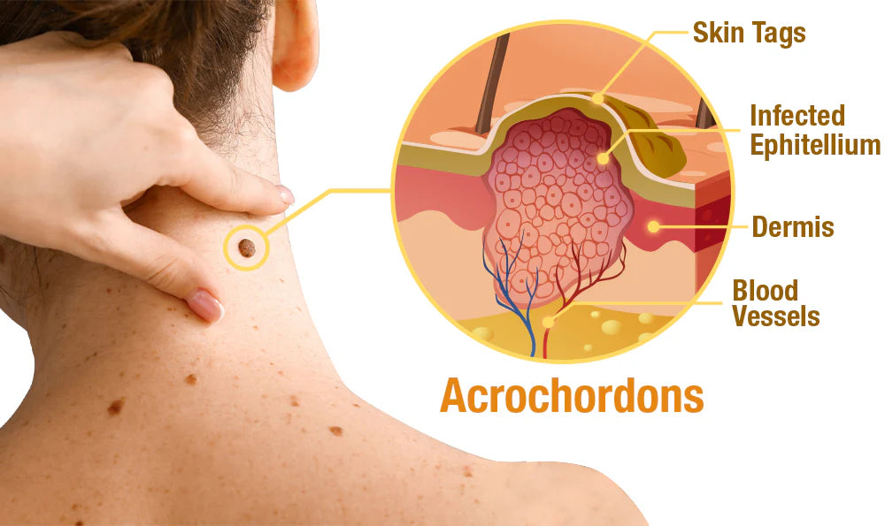 Les acrochordons, également appelés acrochordons, sont de petites excroissances bénignes et molles qui dépassent de la peau. Ils se présentent généralement sous la forme de minuscules lambeaux cutanés de couleur chair ou légèrement plus foncés, souvent attachés à la peau par une fine tige ou un pédoncule. Les acrochordons sont courants, mais des facteurs tels que la friction, les changements hormonaux, la génétique, l'obésité et la résistance à l'insuline peuvent contribuer à leur formation.